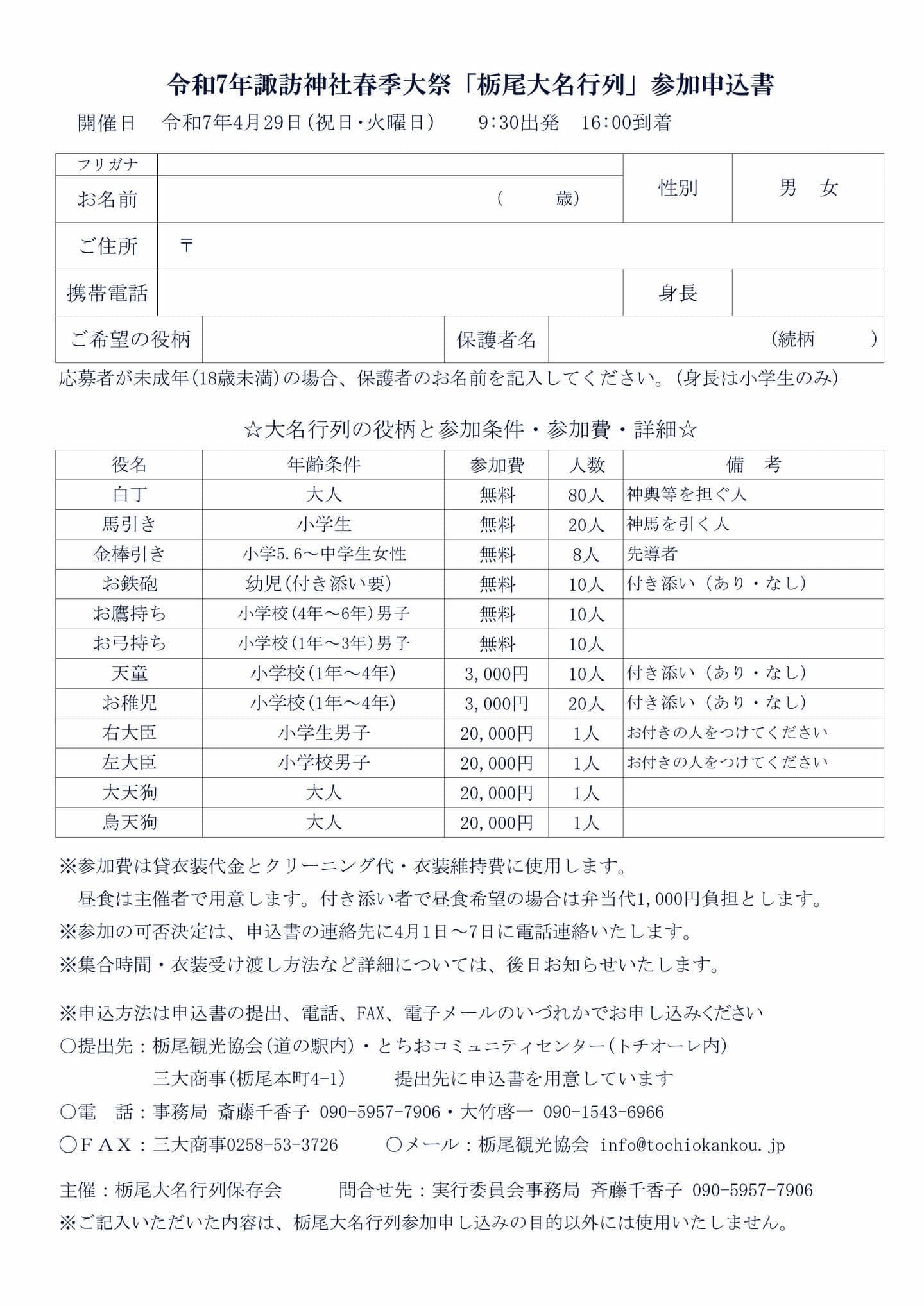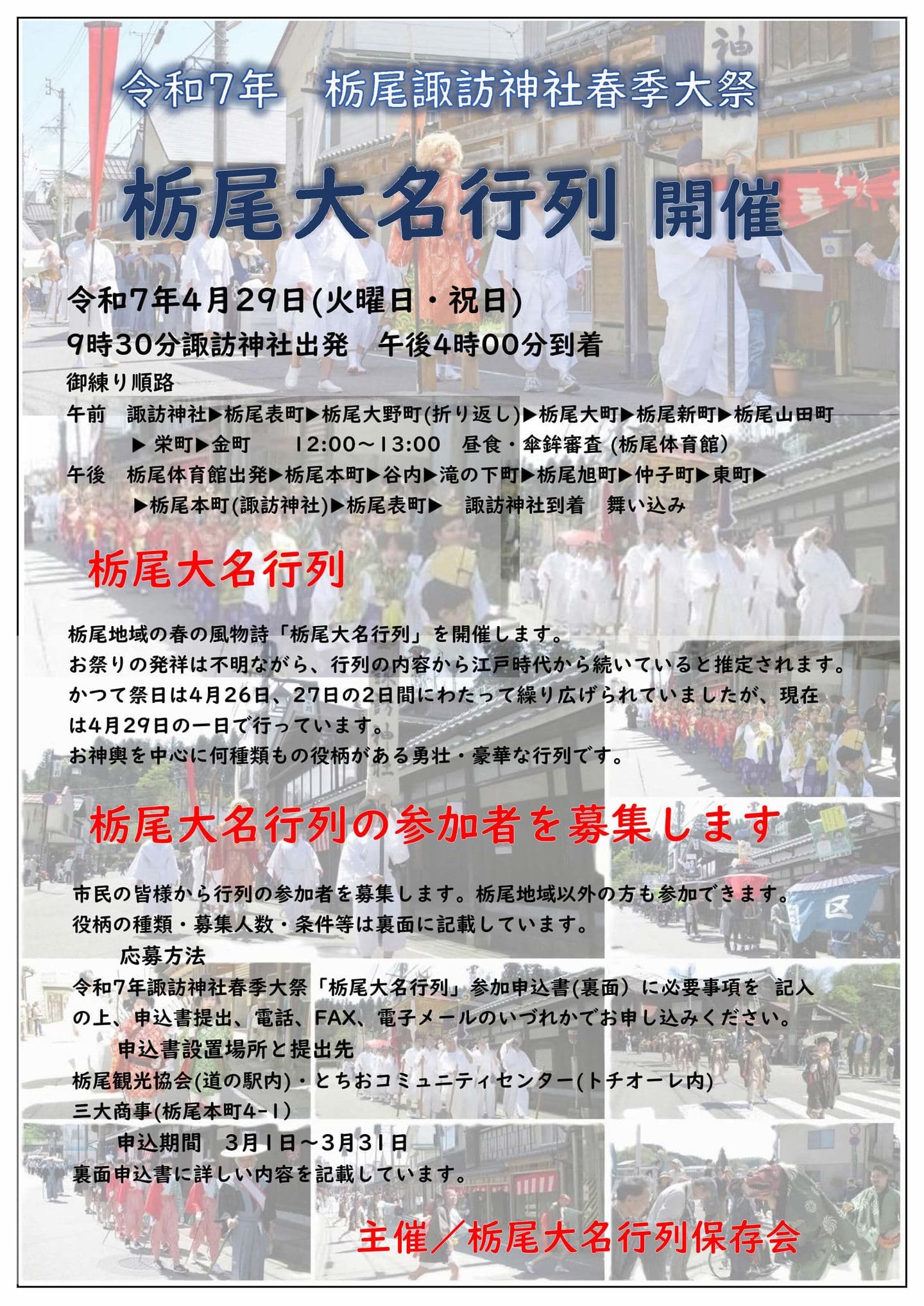 | 主 催 | 栃尾大名行列保存会 事務局:齋藤千香子 090-5957-7906・大竹啓一 090-1543-6966 |