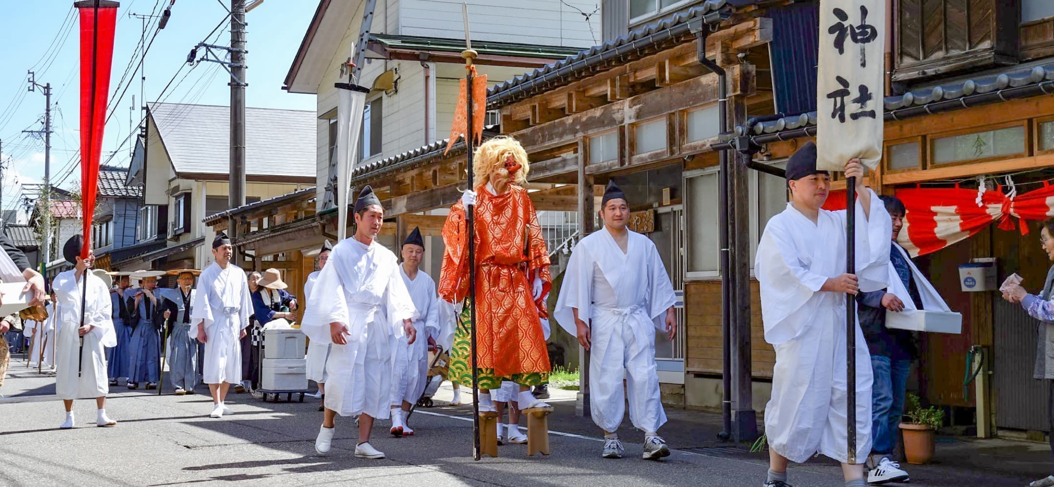春爛漫の4月29日、金色燦然たる神輿を中心に壮大な行列が栃尾の街を練り歩きます。