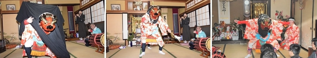 元禄年間、村松の殿様が長岡へ向かう途中、葎谷(むぐらだに)で休憩をした折、殿様を楽しませるため村人が披露したのが始まりと伝えられています。年中行事となり本格的に演舞されるようになったのは延亨4年(1747)といわれ、現在は毎年1月2日に獅子舞が新年のお清めとして集落内の家々を巡ります。