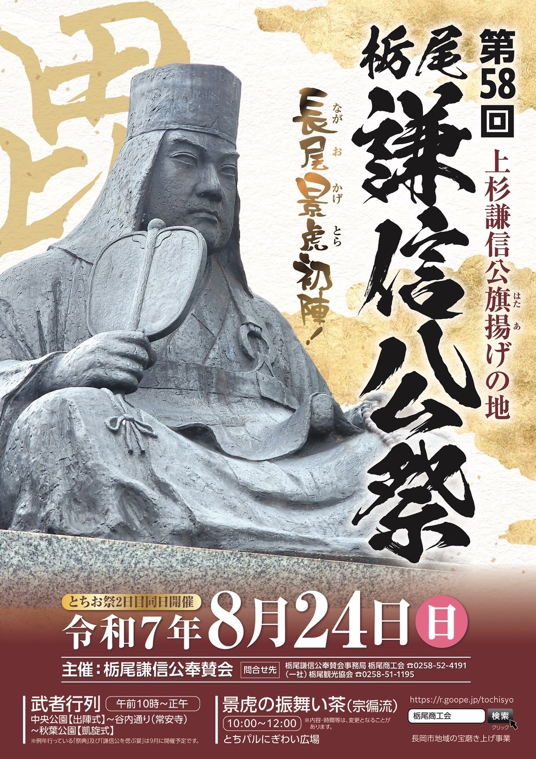 栃尾は謙信公が青年期を過ごし義の心を育み、初陣を飾った地であることから、上杉謙信公旗揚げ(長尾景虎初陣)武者行列、茶会、鉄砲隊演武が開催されます。