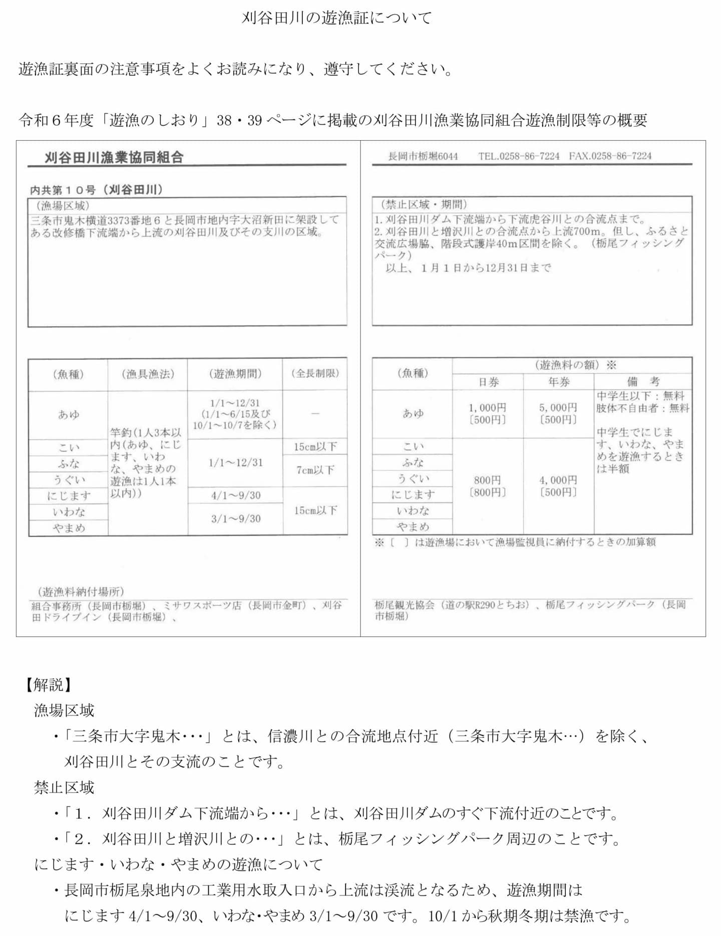 刈谷田川の遊漁証(遊漁券)に関する詳細