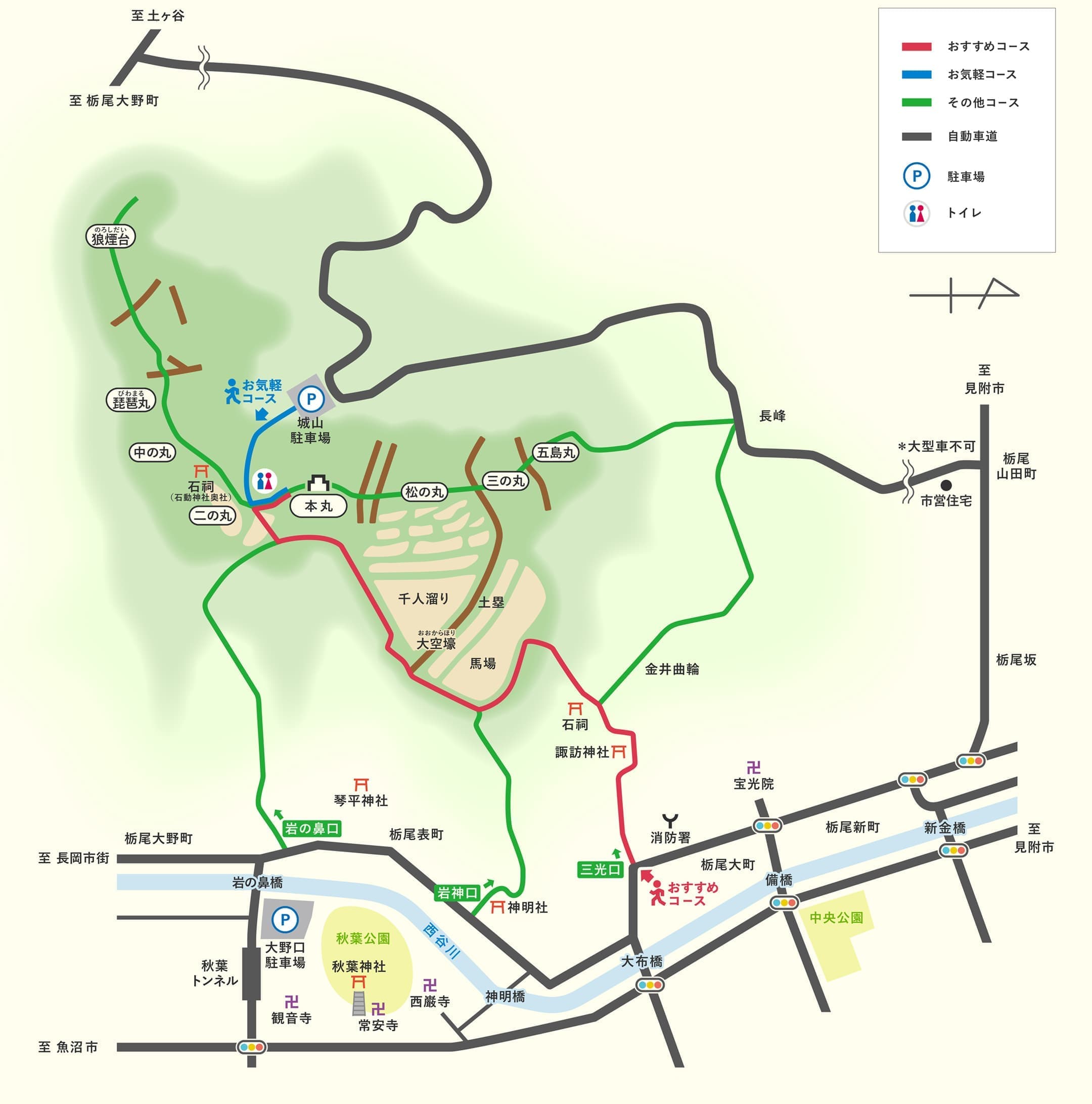 栃尾城跡裏手の城山駐車場から、少し急な登山道を徒歩約7分、ゆっくり登っても約10分で本丸に到着するお手軽なコースです。足元が滑りますので、運動靴など山歩きに適した靴をご用意ください。