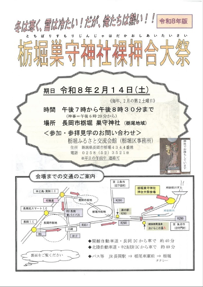 | 問い合わせ | 栃堀区事務所(栃堀ふるさと交流会館内) 長岡市栃堀4344 0258-52-3521(平日9:00~12:00) |